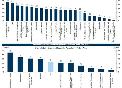Last March, when the world was just learning about the AI crazy that would send markets to bubbly, nosebleed levels, we quoted a report by Goldman’s chief economist Jan Hatzius who used data on occupational tasks in both the US and Europe, to find that “roughly two-thirds of current jobs are exposed to some degree of AI automation, and that generative AI could substitute up to one-fourth of current work. Extrapolating our estimates globally suggests that generative AI could expose the equivalent of 300 million full-time jobs to automation” as up to “two thirds of occupations could be partially automated by AI.”