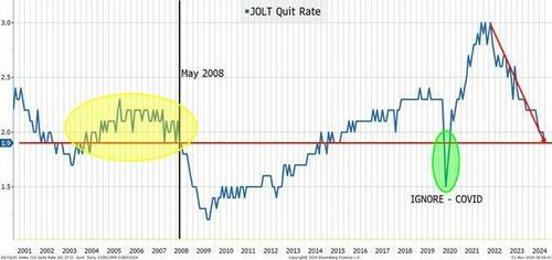 During the financial crisis, the QUIT rate didn’t get this low until May 2008. If I remember correctly, we technically were not in a recession at the time, and only later did the powers that be declare that we actually were in a recession. That fits with my view that this rate is important and may have a predictive element to it.