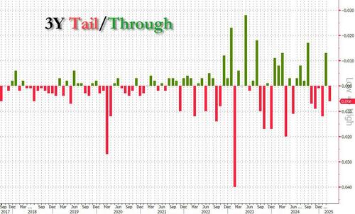The auction priced at a high yield of 3.908% , down sharply from 4.300% in February and the lowest since October; it tailed the When Issued 3.902% by 0.6bps, the 5th tail in the past 6 auctions.
