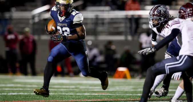 Lafayette wide receiver Josh Simpson (7) runs the ball during a game against Poquoson at Wanner Stadium in Williamsburg on Thursday, Nov. 7, 2024. (Kendall Warner / The Virginian-Pilot)