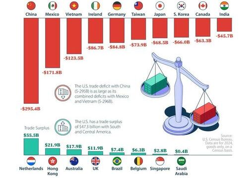 The largest trade deficits are with China, Mexico, and Vietnam. Notably, the U.S. deficit with China alone ($295 billion) nearly equals its combined deficits with Mexico and Vietnam ($296 billion).