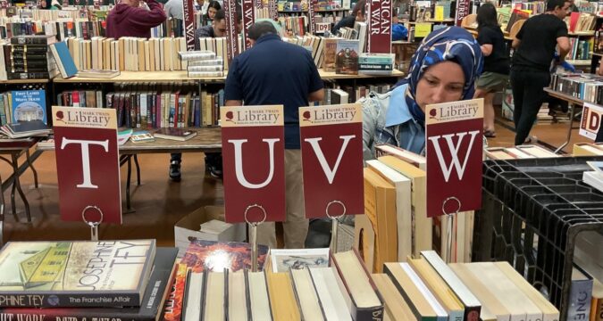 Admission is free, as is parking. The books are individually priced, except on Monday when there’s a set price of $10 for a box of books. That deal clears out a lot of the inventory so that the library can start preparing right away for next year.