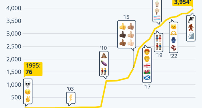 As Statista’s Katharina Buchholz reports, a recently suggested update that would grow the number of emojis to almost 4,000 next year contains 164 additional pictograms, but only nine completely new ones.