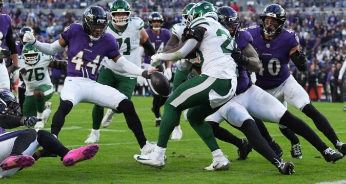 Hall’s 40-yard reception put the Jets inside the red zone with a chance to trim the Ravens’ lead to just three points with less than seven minutes remaining. But on a 2nd and 5 on the Ravens’ 12-yard line, Hall ran for 10 yards, but Ravens cornerback Marlon Humphrey stripped the ball out of his right hand and safety Alohi Gilman recovered the ball for the Ravens on the three-yard line.