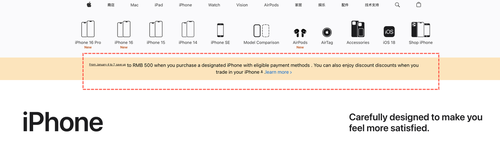 The Apple promotion also includes discounts of 200 to 300 yuan on older iPhone models, as well as other categories of products such as MacBook laptops and iPad tablets. Customers must use designated payment methods including WeChat Pay or Alipay to qualify for the discounts.