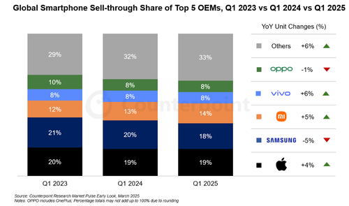 Malhotra said, “Sales in January were particularly strong, with a subsidy-led demand boost in China. The momentum continued with major launches like Samsung’s S25 and iPhone 16e, but it turned quickly as economic uncertainties and trade war risks started mounting, especially towards the end of the quarter. We continue to analyze changes in policies and are currently projecting the market to decline YoY in 2025, despite growth in Q1.”