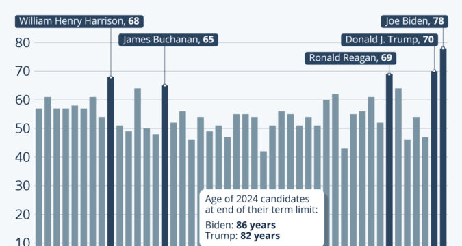 In fact, as Statista’s Katharina Buchholz shows in the chart below, Biden and Trump were the oldest U.S. presidents ever at the time of their inauguration. Trump was 70 years old in 2017 and Biden was 78 in 2021. Ronald Reagan, who was 69 in 1981, comes third. At the start of a second term, Biden would be 82, making him 86 when reaching his term limit. Trump is now 78 – the same age as Biden when he started his first term – and would be 82 at term limit.
