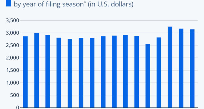 Statista’s Katharina Buchholz reports that, as of December’s data, last year’s tax seasons saw an average refund amount for individual income tax returns of $3,138.