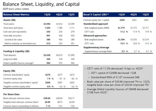 Turning to asset quality, aside from some concerns about Private Credit (see below), the results were solid with BofA’s net charge-offs down 3% to $1.41 billion, below the estimate of $1.42 billion while the provision for credit losses also dropped to $1.34 billion, and also below estimates of $1.5 billion, and down $143MM YoY. As BBG notes, the number “came in way below estimates, offsetting larger-than-expected numbers for some of its peers. Overall, the combined tally is tracking lower than feared, helping soothe concerns about private-credit contagion into financials.” BofA also announced a net reserve release of $72MM in 1Q26 vs. net reserve build of $28MM in 1Q25 and $21MM in 4Q25. Meanwhile, the allowance for loan and lease losses of $13.1B represented 1.09% of total loans and leases. Nonperforming loans (NPLs) of $5.8B decreased $0.3B from 1Q25, and were flat to 4Q25, as higher consumer NPLs, driven by residential mortgage relief extended for borrowers impacted by 2025 California wildfires, were mostly offset by lower commercial NPLs.