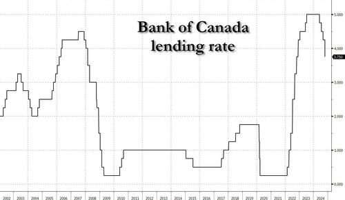 In keeping up with the global easing frenzy, and also in keeping with its promises from last month when it said to “expects further cuts”, moments ago the Bank of Canada – home of what may be the world’s biggest housing bubble – stepped up the pace of interest-rate cuts and signaled that the post-pandemic era of high inflation is over when the central bank cut the benchmark overnight rate to 3.75% on Wednesday, the biggest reduction in borrowing costs since March 2020 during the early days of the pandemic.