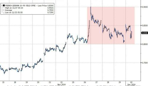 France’s benchmark yield spreads have come off the day’s wides after the latest headlines show the government may have made a further compromise in its bid to save the budget.