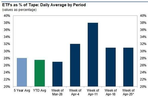 Amid yesterday’s equity meltup, ETFs accounted for 34% of the overall tape (vs an YTD avg 28%) as the desk skewed better to buy driven by a mix of domestic, international and sector exposures.