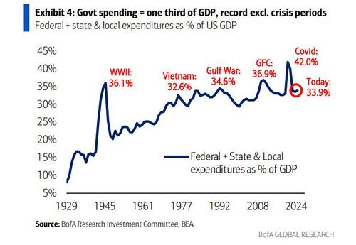 This is precisely what we noted last week when we showed that in 2024, one third of GDP came from government spending, a record high excluding periods of war or crisis; this was financed by 6-7% budget deficits, another unwelcome peacetime record, as Bank of America itself admitted.