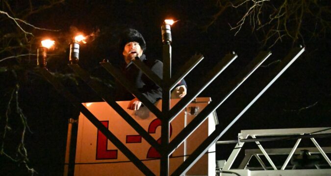 Rabbi Yaacov Halperin and Bethlehem firefighters light three candles Monday, Dec. 15, 2025, on a Hanukkah menorah at Payrow Plaza in Bethlehem. Monday was the second night of the eight-day Jewish Festival of Lights. The third candle is the shamash, a ninth candle that is used to light other candles. (Amy Shortell/The Morning Call)