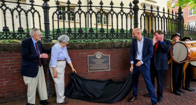 Hank Barnette, vice chair of the Bethlehem World Heritage Council, Charlene Donchez Mowers, senior adviser and historian of the Bethlehem World Heritage Council and Commission, Bethlehem Mayor J. William Reynolds and Northampton County Executive Lamont McClure unveil a plaque Saturday, Sept. 6, 2025, during the Bethlehem World Heritage Community Celebration in Bethlehem. The city and the Moravian settlements organization hosted the event commemorating the Moravian Church Settlements recognition as a UNESCO world heritage site. (April Gamiz/The Morning Call)