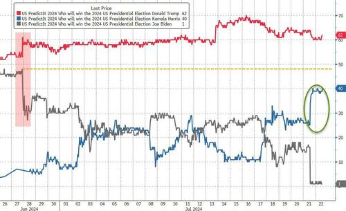 President Biden’s removal from the ticket for the 2024 election sent Kamala Harris odds of winning in November soaring (but we note she remains below the pre-debate levels that Biden had reached)…