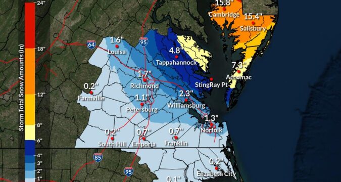 Norfolk, Portsmouth and northern areas of Virginia Beach, Chesapeake and Suffolk likely will see 1-2 inches of snow. Southern areas of those cities could see up to an inch.