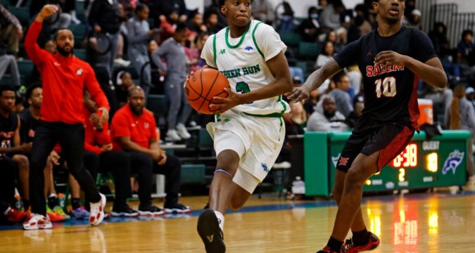 Landstown’s Alan Walker dunks the ball against Salem’s Terrell Lewis during the second half at Salem High School in Virginia Beach, Va., on Jan. 30, 2026. (Peter Casey / The Virginian-Pilot)