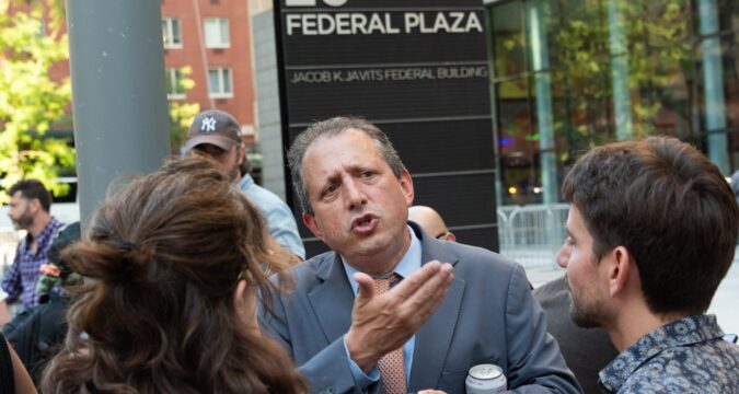 City Comptroller Brad Lander, State Senator Julia Salazar and other elected officials speak to the media outside 26 Federal Plaza in Manhattan, New York City on Thursday, Sept. 18, 2025. (Gardiner Anderson / New York Daily News)