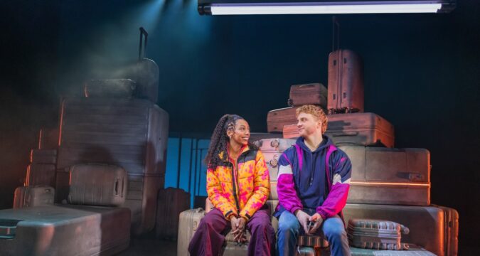 On the plus side, “Two Strangers” does have quite a witty book and a few sticky tunes. Dougal will be a dreamboat, I suspect, for some teen theatergoers, and there is an amusing set from Soutra Gilmour that imagines New York entirely through carry-on luggage, spinning on a turntable that resembles baggage claim. It’s cool.