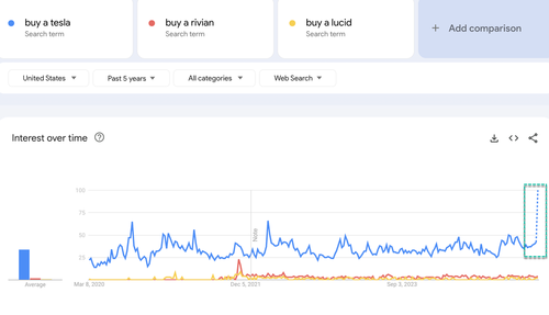 We found that searches for ‘buy a Tesla’ hit a record high nationwide. To confirm that the broader EV market remains in a bear trend, we also compared this search trend with others, including ‘buy a Rivian’ and ‘buy a Lucid’—both of which, show no movement this week—just searches for Tesla.