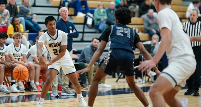 Neuqua Valley’s Carter Coviello, left, guards Oswego East’s Mason Lockett during a game in the Hoops for Healing Tournament in Oswego on Friday, Nov. 28, 2025. (Sean King / Naperville Sun)