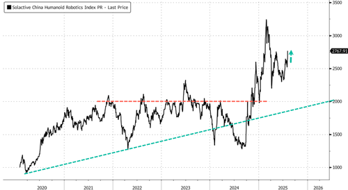 The Solactive China Humanoid Robotics Index – a thematic equity index tracking Chinese companies involved in the commercialization of humanoid and robotics technologies – jumped more than 4% on Wednesday after Chinese robotics firm Unitree released a stunning video of its new robot dog.