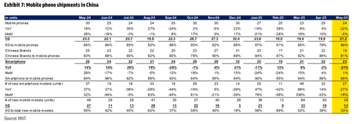 Smartphone shipments in China were -21% YoY to 23m units in May vs. -2% YoY in Apr 2025, per MIIT.