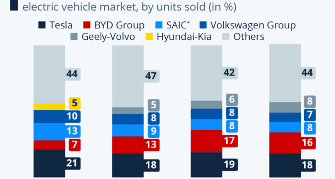 The BEV portfolio of legacy automakers like Volkswagen and Geely-Volvo stood at 7 and 8 percent, respectively, while SAIC, which includes the joint venture between the Chinese state-owned SAIC Motor and Wuling as well as General Motors, also had a market share of 8 percent as of the most recently available data.