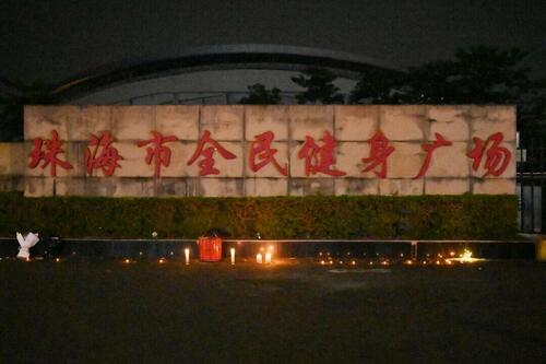 Lighted candles left outside the Zhuhai Sports Centre, a day after a car rammed through the site killing dozens in Zhuhai, in south China’s Guangdong province on Nov. 12, 2024. Michael Zhang/AFP via Getty Images