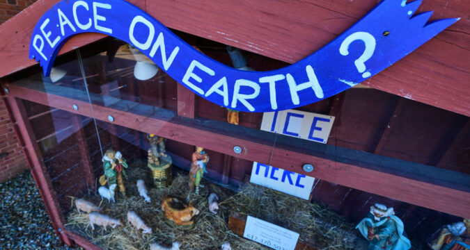 In another Chicago suburb, not far from an Immigration and Customs Enforcement facility that has drawn protests over detentions, a sign at the manger outside the Urban Village Church says “Due to ICE activity in our community the Holy Family is in hiding.” And more than a thousand miles away, the Christ child went missing from a Nativity scene at St. Susanna Parish in Dedham, Massachusetts, replaced by a hand-painted sign: “ICE was here.”
