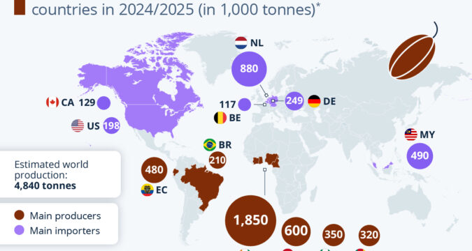 The Netherlands, Germany, and Belgium, for example, together import approximately 25 percent of the world’s cocoa beans. This makes the European Union the world’s largest importer of cocoa, accounting for 60 percent of global imports.