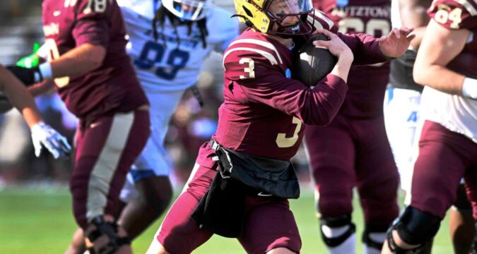 Kutztown University quarterback Judd Novak connects with wide receiver Trvor Amorim against Assumption during a 56-19 Golden Bear victory over the Greyhounds in an NCAA Division 2 second-round playoff on Saturday, Nov. 29, 2025, at Andre Reed Stadium. (BILL UHRICH/READING EAGLE)