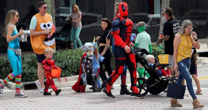 Stay cool. The first important reminder is that we live in Florida. When my oldest was 3, he loved Elmo. Yes, I was the parent who bought the head-to-toe woolly Elmo costume. He wore it long enough to take pictures but then had to sit in the wagon around the neighborhood since he was too hot to move in it. Don’t let the advertising trick you. Be creative and make your own tropical weather costumes. He would have been better off in a T-shirt with Elmo on it and a red hat and shorts. Keep the costumes cool and bring water to stay hydrated.