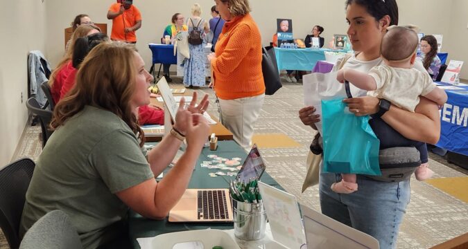 Nathaly Price and eight-month-old daughter Emma chat with Tonia Kitchel of LEAP Solutions at the Porter County Community Baby Shower Friday, Oct. 17, 2025. (Shelley Jones/for Post-Tribune)