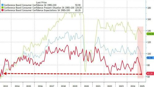 The Conference Board Consumer Confidence headline print fell from 100.1 (upwardly revised) to 92.9 (below 94.0 exp). Under the hood, it was not pretty with the measure of expectations for the next six months dropped nearly 10 points to 65.2, the lowest in 12 years, while a gauge of present conditions declined more modestly.