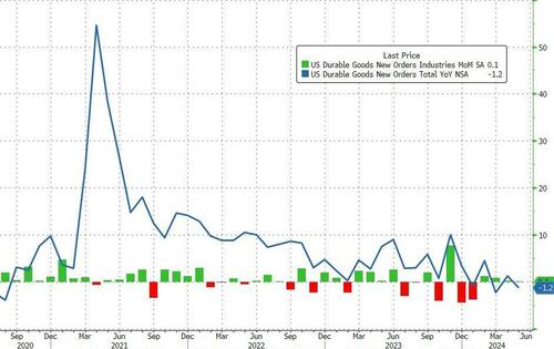 New Orders for Durable Goods in the US rose by just 0.1% MoM in preliminary May data (better than the -0.5% exp, but that was thanks to a major downward revision in April from +0.6% to +0.2%).