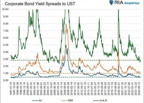 Currently, as RIA’s Lance Roberts shows in the chart below, credit spreads provide investors with the slimmest yield margin over U.S. Treasuries in over 25 years.