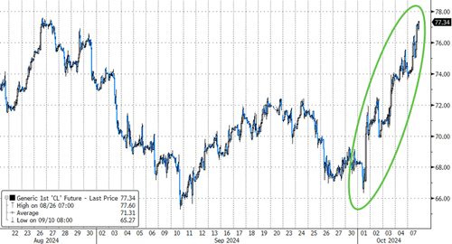 As the anniversary of the Oct 7 attacks hit, more missiles flying in the MidEast sent crude prices higher with WTI above $77 for the first time since mid-August (from three year lows) and fears about Gulf refinery impacts from Milton also spurred prices higher)…