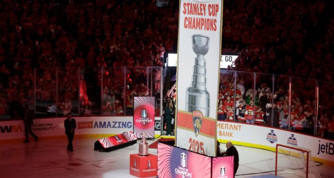 SUNRISE — This never gets old. Never. It even felt better in the repeating late Tuesday afternoon as the “Stanley Cup Champions” banner rose slowly to the rafters, Florida Panthers players watched on the ice with arms locked around each other and the sold-out crowd applauded.