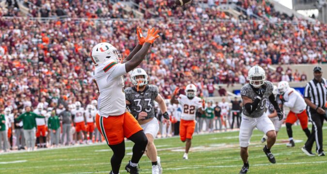 Entering Saturday, Miami (9-2, 5-2) had allowed only nine scrimmage plays of 30 yards or more. Tech broke five: Freshman Jeff Overton’s 38-yard touchdown run, the longest rush by any Hurricanes opponent this year; Marcellous Hawkins’ 33-yard sweep on the Hokies’ first snap of the afternoon; Drones’ 39-yard pass to Ayden Greene; Pop Watson’s connections of 39 yards to Greene and 38 to Isaiah Spencer.