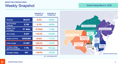 Bright MLS, a multiple listing service covering the Mid-Atlantic region, released new weekly data through March 9 showing that active listings are piling up, totaling 31,597—up 20.2% from the same week one year ago. Week-over-week, active listings across the MLS service area have increased by 3.3%