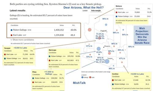 But even if we assume reasonably good totals for Lake in Maricopa County (Phoenix), say even instead -3.6 percent, it looks like Pima County (Tucson) will carry the day for Gallego if the turnout is close to what we have seen.