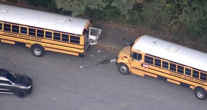 The driver, later identified as 54-year-old Wanda Montalvo de Garcia, was taking part in a routine evacuation drill when she was pinned between the two buses, school district officials told local ABC affiliate WPVI.