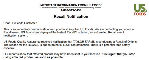 Meanwhile, another big customer of Taylor Farms, US Foods, the largest supplier of food to food service operations in the country, issued a recall notification for Taylor Farms and Cross Valley Farms’ onion, urging restaurants nationwide that it supplies produce: “DESTROY THE PRODUCT.”