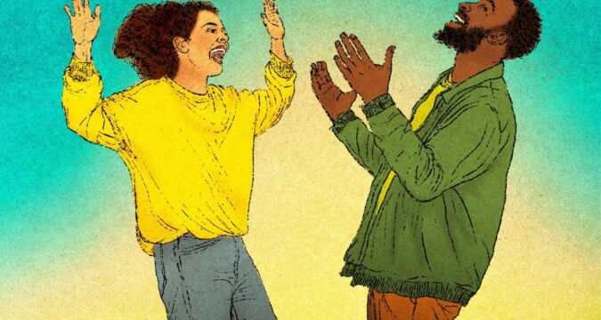 The simplest: Get together with another person, look in each other’s eyes and repeat the sound “ha” for a full minute. Or try the “breathe in and laugh.” Bring your hands to your chest on a deep inhale, hold your breath for three seconds, and burst out laughing on the exhale while extending your hands forward.