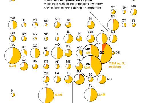 Nationwide, the US General Services Administration, which oversees the leasing and management of government buildings, spends about $5 billion annually on rent for roughly 144 million square feet of office space—one-third the size of Manhattan’s entire office market.