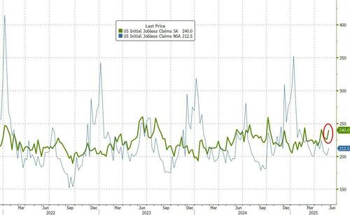 The number of Americans filing for jobless benefits for the first rose to 240k last week – the most in a month and more than expected…