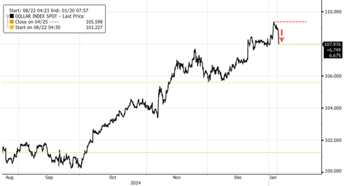 WaPo’s report sent the Bloomberg Dollar Index tumbling early Monday, breaking below $108. This marked a sharp reversal following the multi-month 9% rally that started at the beginning of October.