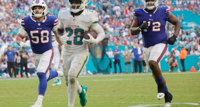The Miami Dolphins (3-7) pulled off a commanding 30-13 win against the AFC East rival Buffalo Bills (6-3) on Sunday, snapping a seven-game losing streak against Buffalo. The photo gallery captures the explosive performance of running back De’Von Achane, who scored two long touchdowns, and a deep touchdown catch by Jaylen Waddle. The defense held Bills quarterback Josh Allen in check and forced three critical turnovers in the victory.